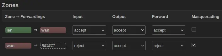 lan => wan: the conditions for which connections from thelaninterface are forwarded to to thewaninterface.Input: accept: thelaninterface accepts all connections originating from the network (I wouldn’t understand the point of setting this to bereject).Output: accept: all connections exiting thewaninterface are accepted (again, I’m not sure what the point of this would be).Forward: accept: forwarding of packets fromlantowanis allowed.- Masquerade: I honestly don’t know what the effect of enabling this would be. What would it mean to masquerade the