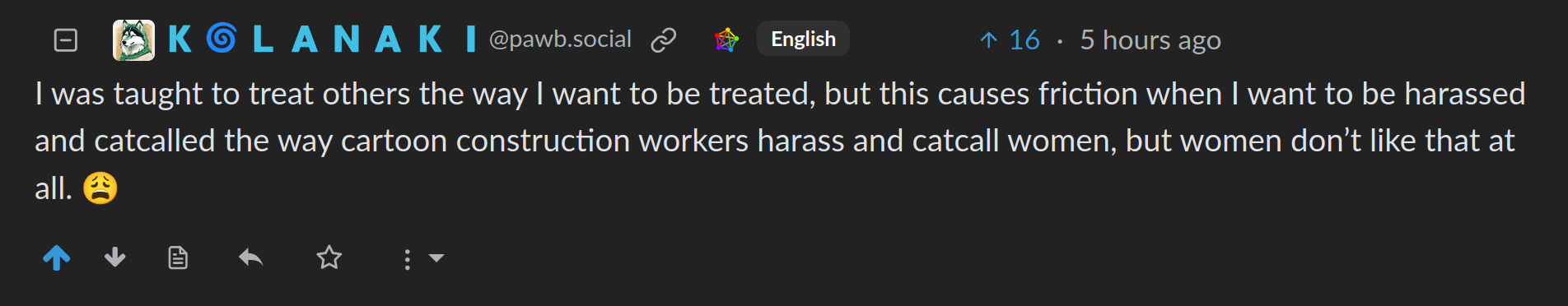 I was taught to treat others the way I want to be treated, but this causes friction when I want to be harassed and catcalled the way cartoon construction workers harass and catcall women, but women don’t like that at all. 😩
