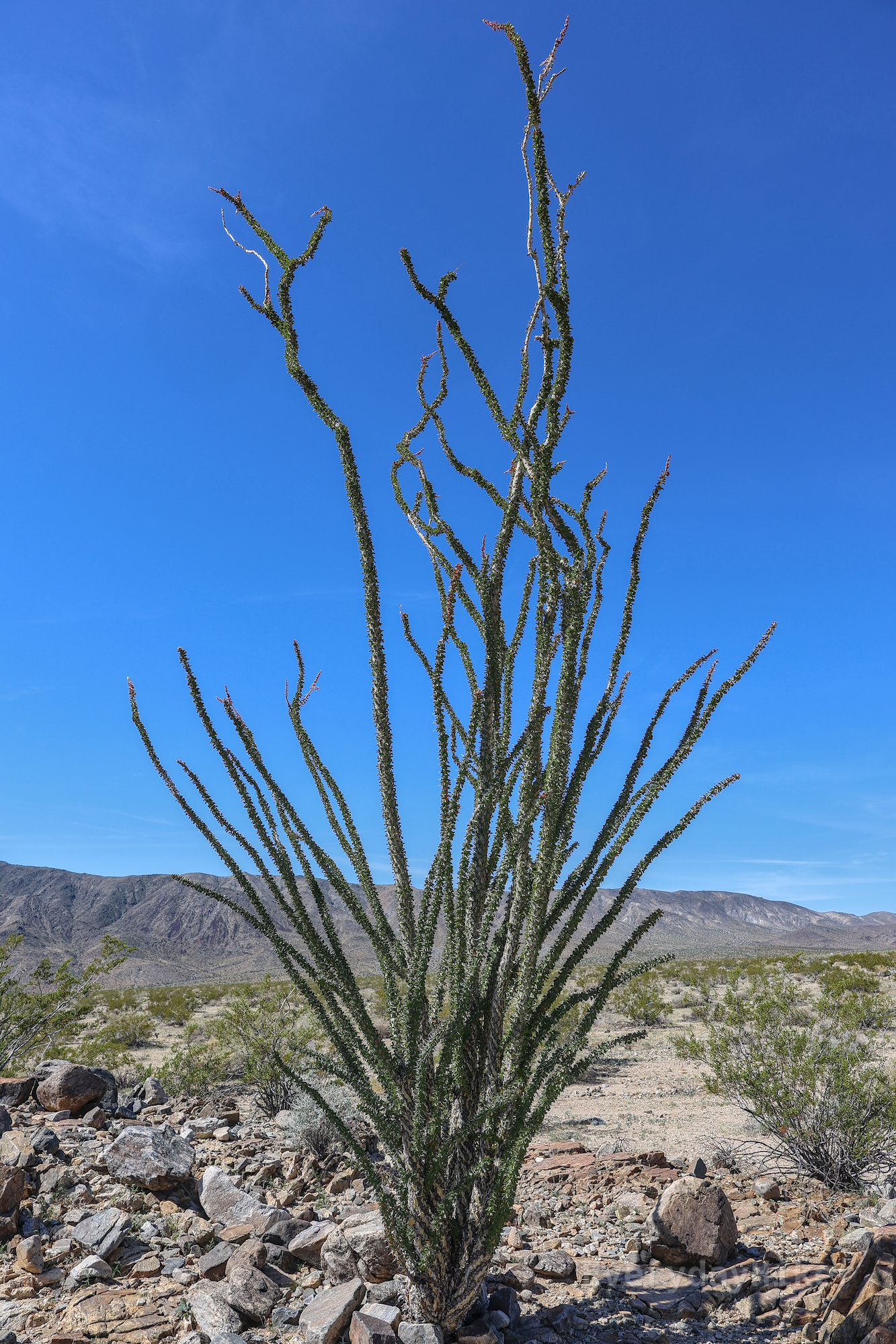 An Ocotillo plant with its long, spindly arms covered in small green leaves.
