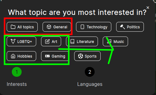 - How about the instance selection wizard (click “join a server” on the homepage), which lets you select topics and languages to select instances. Do the current options make sense?