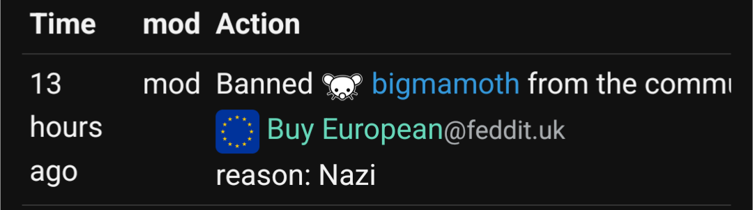 Nazis should expect people to mod them, sometimes without a specific reason. https://lemmy.world/modlog?page=1&actionType=All&userId=16211708