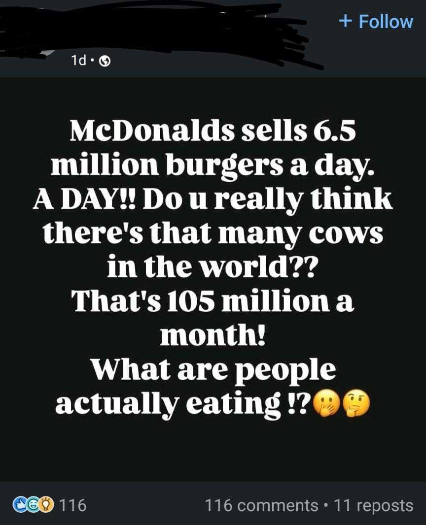 Honestly mind boggling that 125 thousand cows are slaughtered each month just to support maccas. Once you add various other places selling beef burgers and other beef cuts and I imagine the number can get a lot bigger