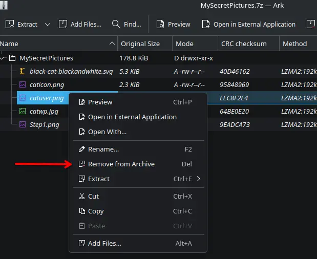 Removal of pictures from the 7-zip is as simple as rightclicking on them: