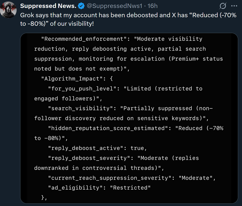 arrow-up191arrow-down1imageGrok claims the Twitter algorithm limits visibility for anti-Israel accountsgeneva_convenience@lemmy.ml to Technology@lemmy.ml · edit-27 days agomessage-square36linkfedilinkfile-text