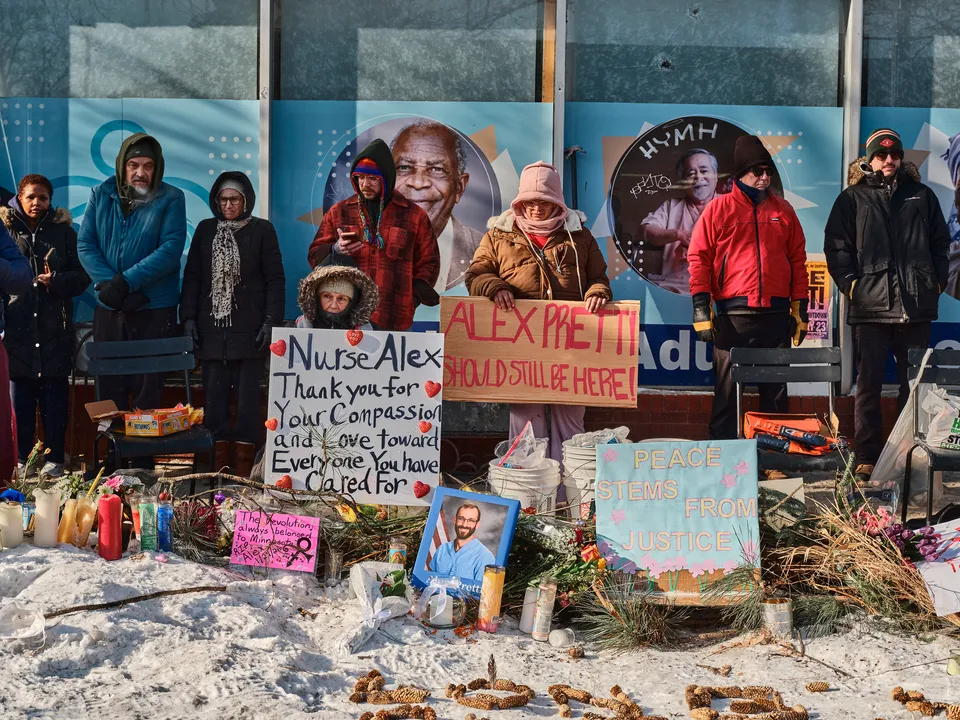 A temporary memorial near the site where Alex Pretti was fatally shot, in Minneapolis.Photograph by Philip Cheung for The New Yorker