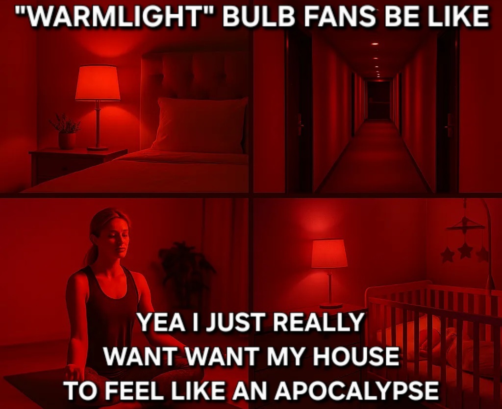 I use red bulb (or just leds now) unironically, I can see good enough to walk at night and they don’t fucking hurt my eyes like dumbass white bulbs. Seriously how do people use those white bulbs? Just going to a hospital is painful.