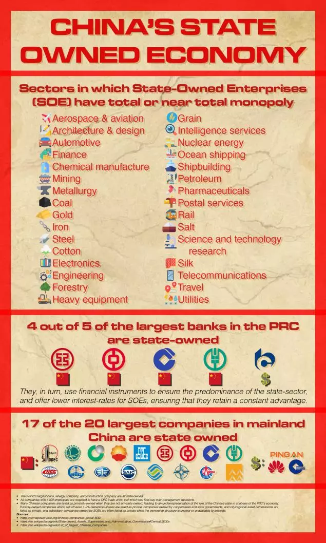 Even checking Wikipedia, data from 2022 shows that the overwhelming majority of the top companies are publicly owned SOEs. This is China’s strategy, they’ve been honest about it from the beginning. The private sector is about half cooperatives like Huawei or farming cooperarives and sole proprietorships, with the other half being small and medium firms. As these grow, they are folded into the public sector gradually. This is China’s Socialist Market Economy.
