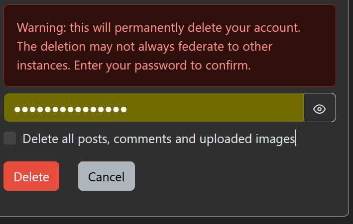 minus-squareحمید پیام عباسی@crazypeople.onlineOPlinkfedilinkarrow-up15·3 days ago Locate your avatar in the top right of the screen and select “Settings” Select “Delete Account” Enter your password and select “Delete”