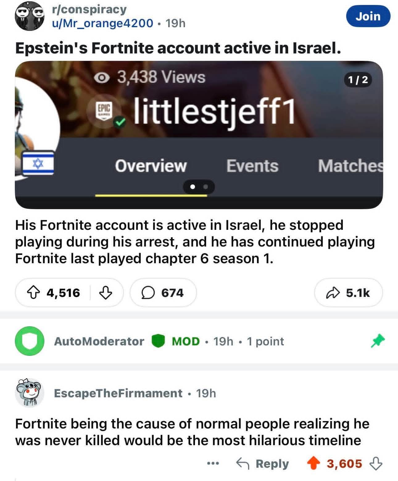 The fortnite account shows it was active like 2 months after his “death” but way before the files were released. Like 10 months before the files were released. Also there was a prison guard on 4chan (he got identified and was working at the prison) who claimed of an off the books transport van that showed up the evening before his death and it was kept out of the log books. Also that bit of footage the night of his death at the prison that showed just the tiniest bit of an orange jumpsuit going towards Epsteins cell. And all the cameras that just strategically managed to not be working.