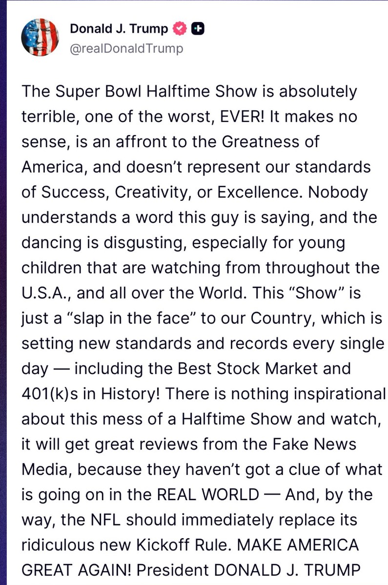 He’s racist. He’s not ridiculous. He’s a fucking racist. Him and that racist halftime show that for some reason not a single person I’ve seen has called out for being racist even though it’s very fucking clearly just a big racist celebration of racism? For the racist president???