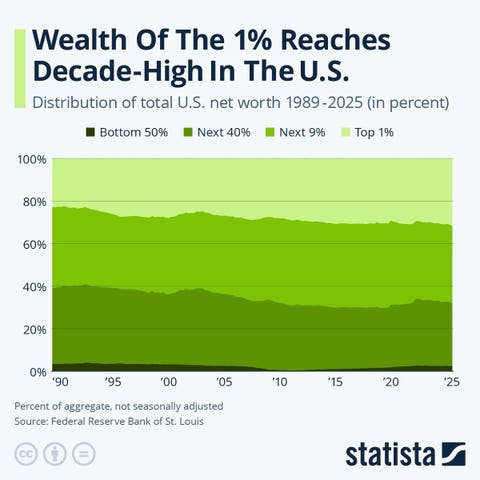 The share of wealth owned by the 1% of richest people in the United States has reached a new record of 31.7% in the third quarter of 2025