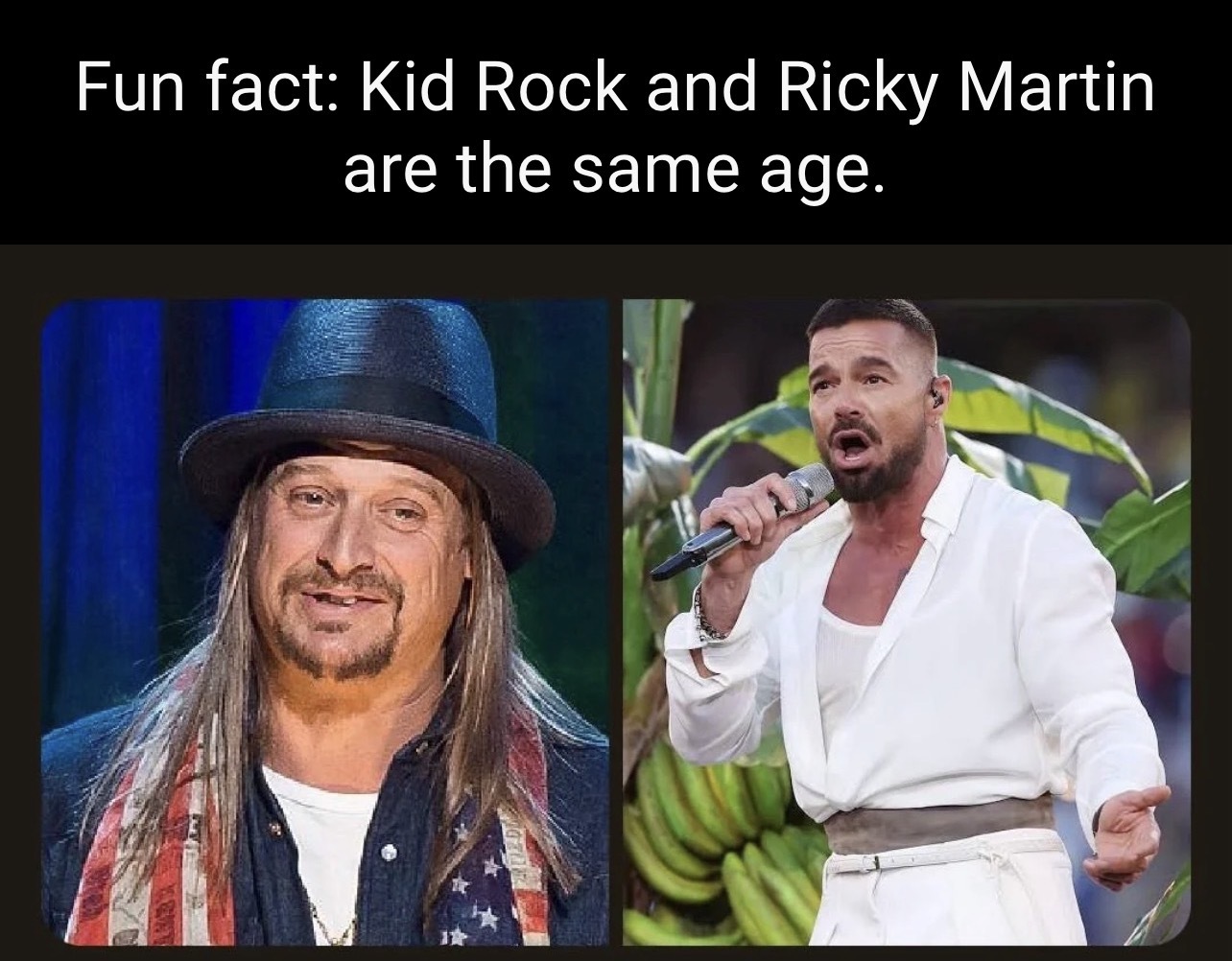 arrow-up1689arrow-down1imageRicky Martin is aging like wine, Kid Rock is aging like milk left out in the sun in Arizona.WanderWisley@lemmy.world to memes@lemmy.world · 2 months agomessage-square94linkfedilink