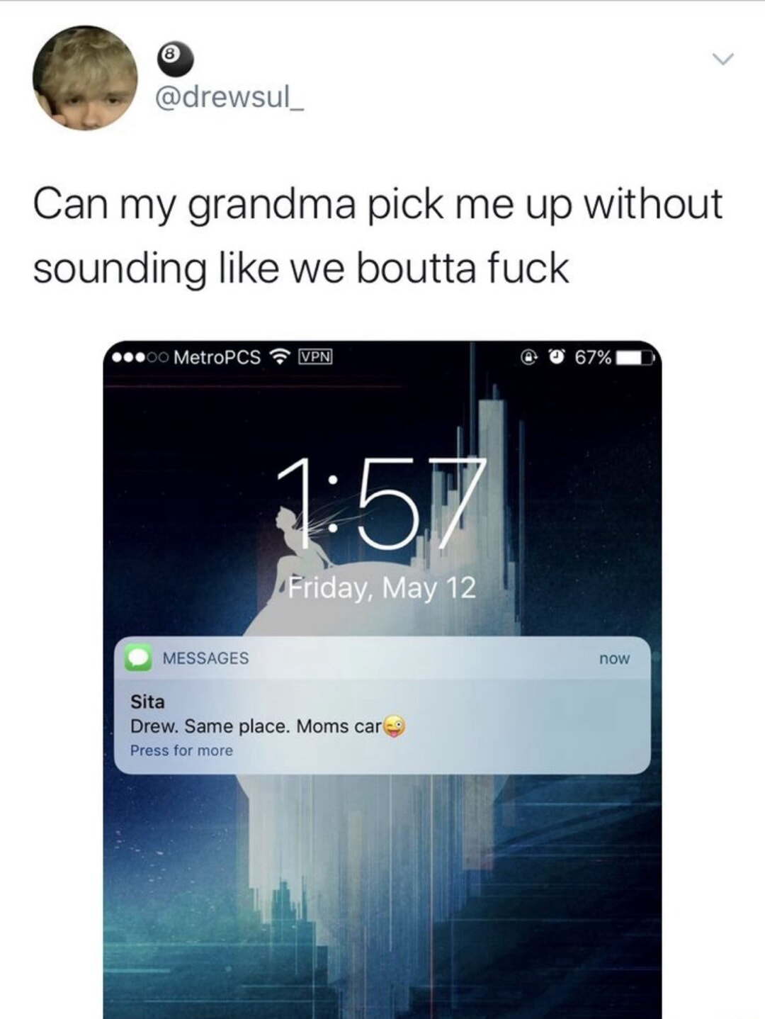 I duckduckwent and searched “Can my grandma pick me up without sounding like we boutta fuck” and found an uncensored one lol