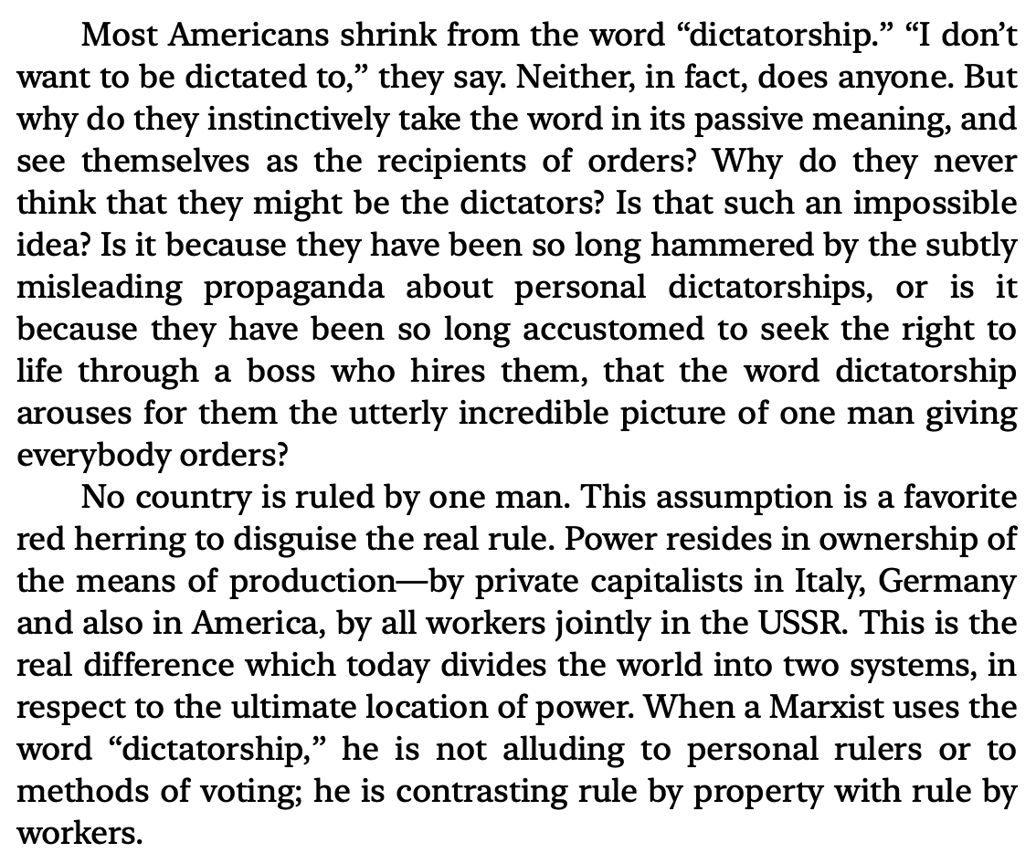 The Communist is asking “what part of dictatorship of the PROLETARIAT do you not understand?” Because they think the society Anarchists want is a form of a dictatorship-of-the-proletariat.