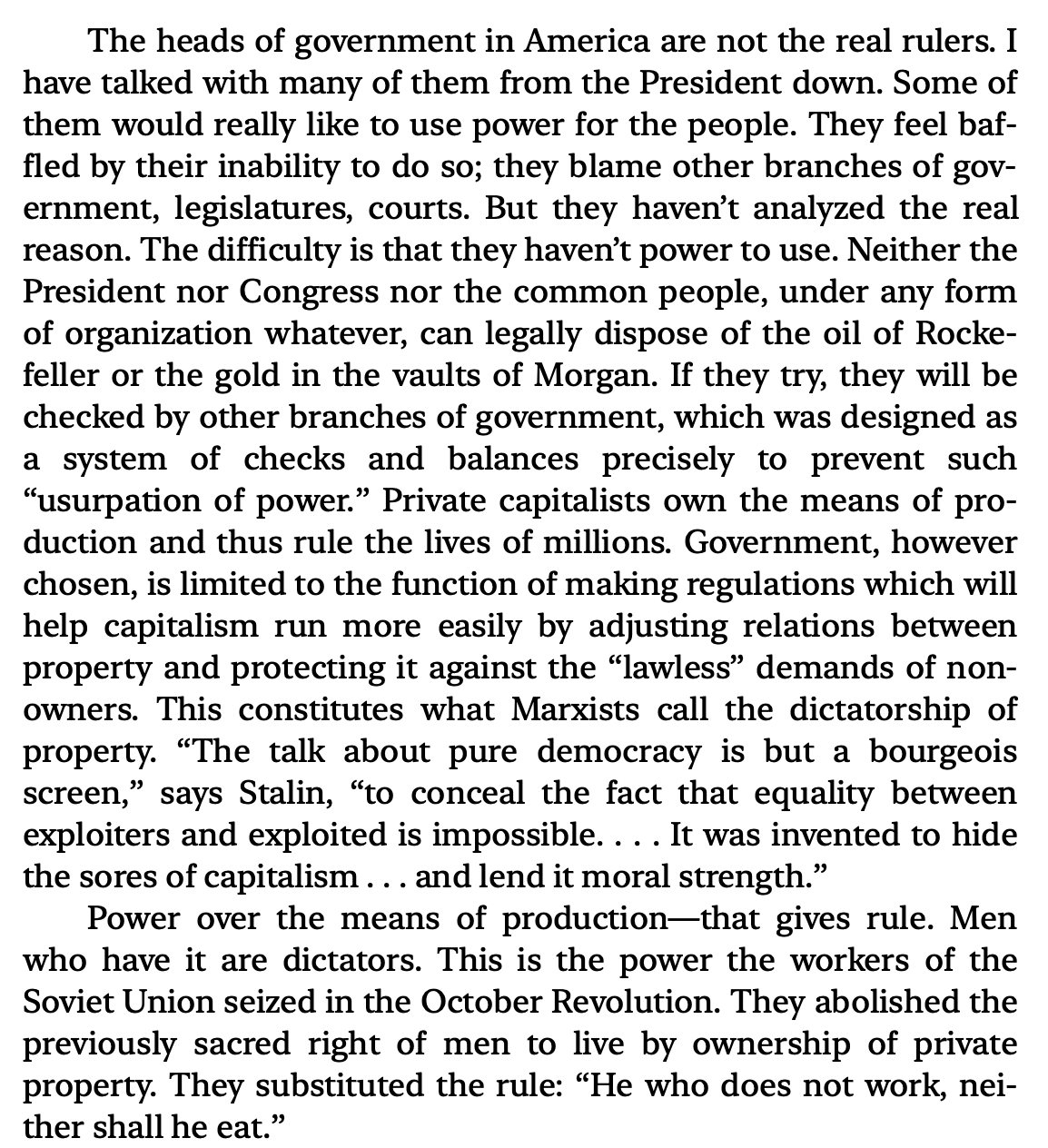 That concentration of power means the system is ripe for abuse. Maybe not in the beginning when the leaders are versed in Marxism or whatever socialism they believe in. But eventually this power going to someone with selfish intentions will not be good.