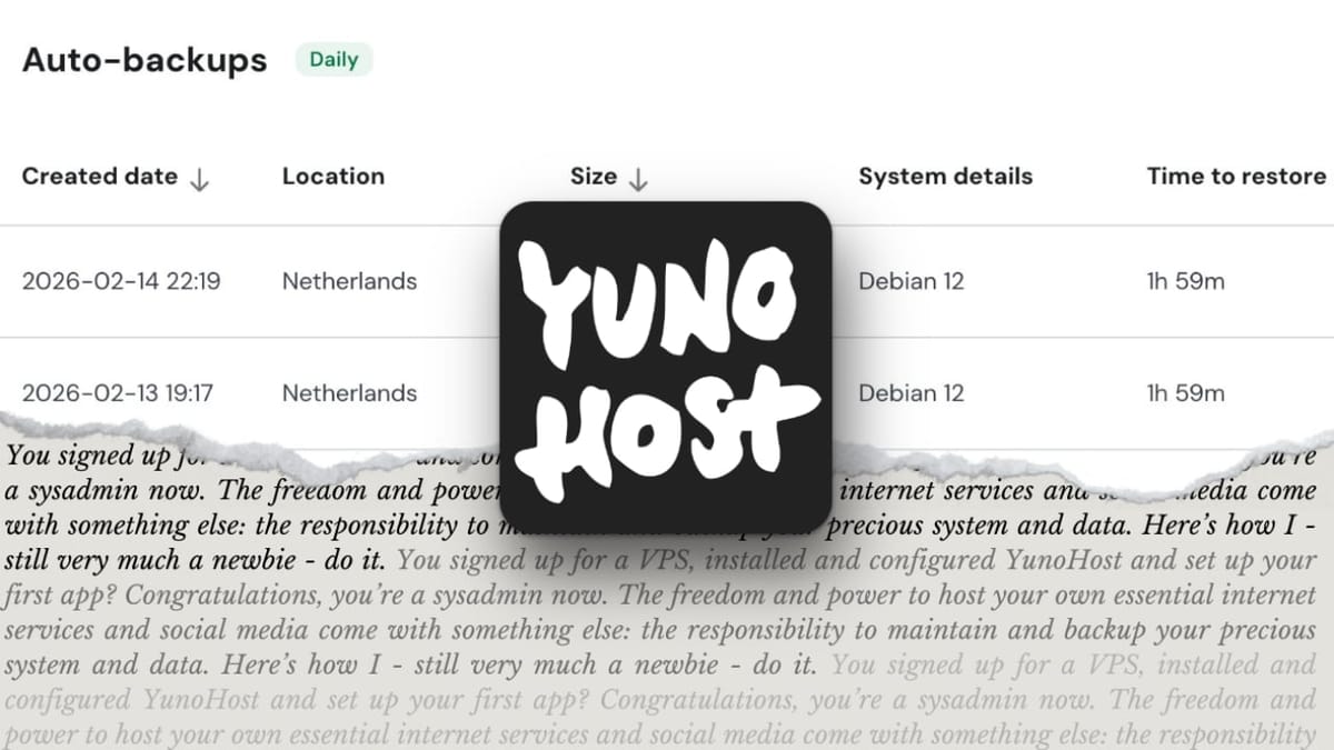 The fourth article in my series about “self-hosting for newbies” explaining how I take care of backups for my YunoHost server.