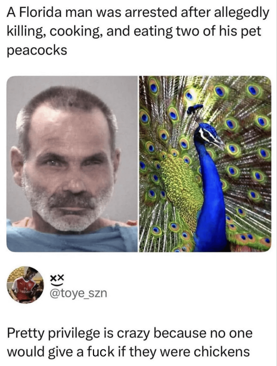 Here’s the news story about it: https://www.wtsp.com/article/news/local/pascocounty/man-kills-eats-pet-peacock-pasco-county/67-d216ccbf-d32a-462c-be3d-65c41907095e