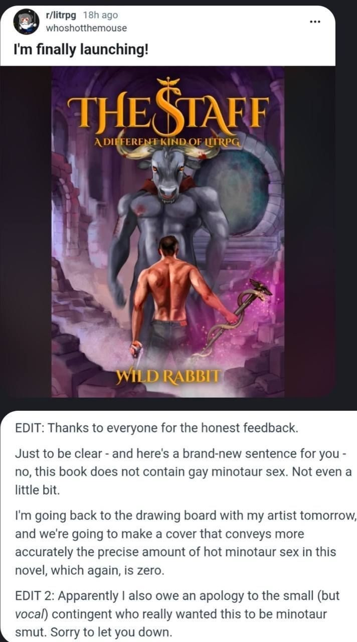 EDIT 2: Apparently I also owe an apology to the small (but vocal) contingent who really wanted this to be minotaur smut. I’m doing my part. Now get typing.