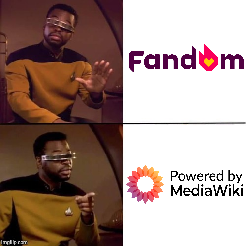 It invalidates your point. You’re trying to gatekeep what does and does not constitute a “wiki” while clearly having no idea what that word means. And if you knew Fandom uses MediaWiki, it clearly doesn’t show in your meme, because a) Fandom is powered by MediaWiki so it’s not mutually exclusive like Geordi implies, and b) like Fandom, most indie wikis in my experience don’t use the “Powered by MediaWiki” icon either (just in case you’d go with that bizarre, last-ditch non sequitur of an argument). Your meme is nonsense if Fandom uses MediaWiki, which it does.
