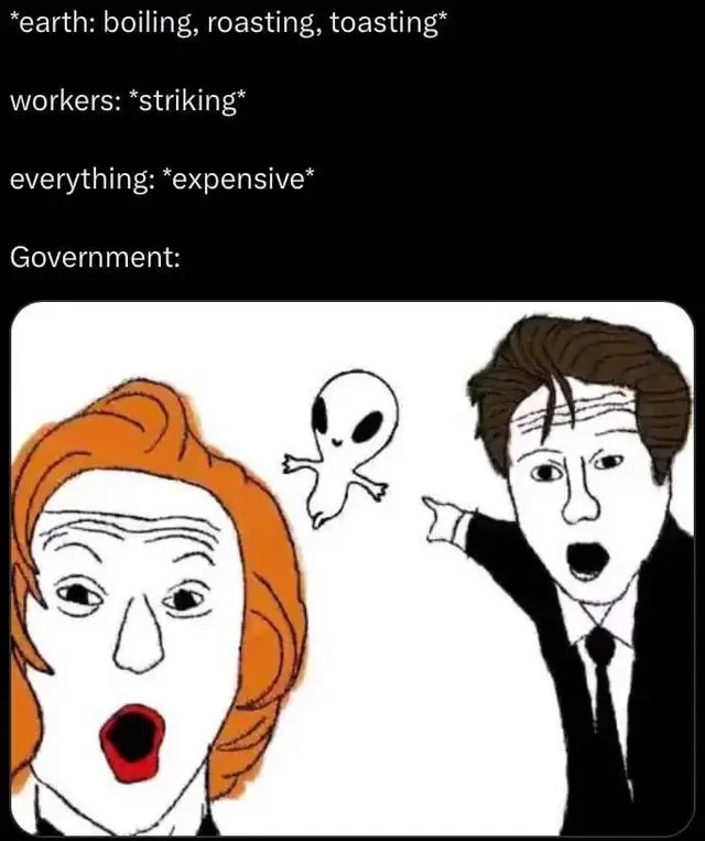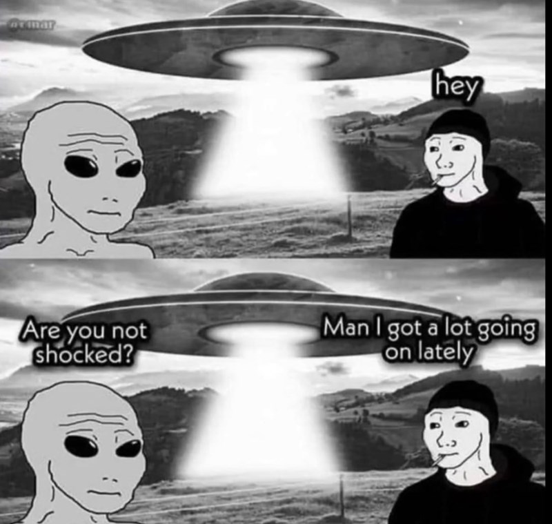 At this point a real alien could come down the sky and people wouldn’t give a fuck. Hard to care about aliens when you are homeless and starving