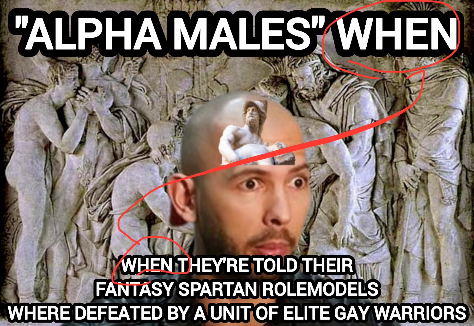 WHEN WHENTHEY’RE TOLD THEIR FANTASY SPARTAN ROLEMODELS WHERE DEFEATED BY A UNIT OF ELITE GAY WARRIORSIt’s a boomer inspired meme that is now viral. They think it’s funny. Ignore it.