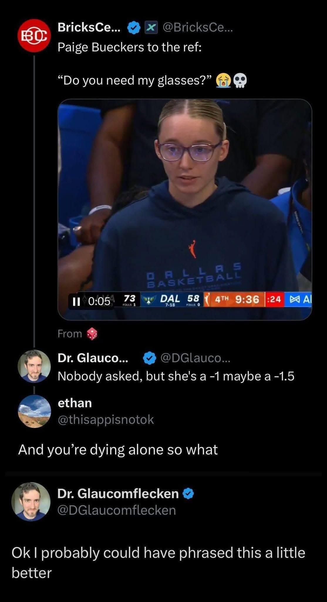 My understanding is that the Dr. was referring to her glasses prescription, but the numbers he provided were misinterpreted as some sort of rating on her appearance (or perhaps basketball performance).
