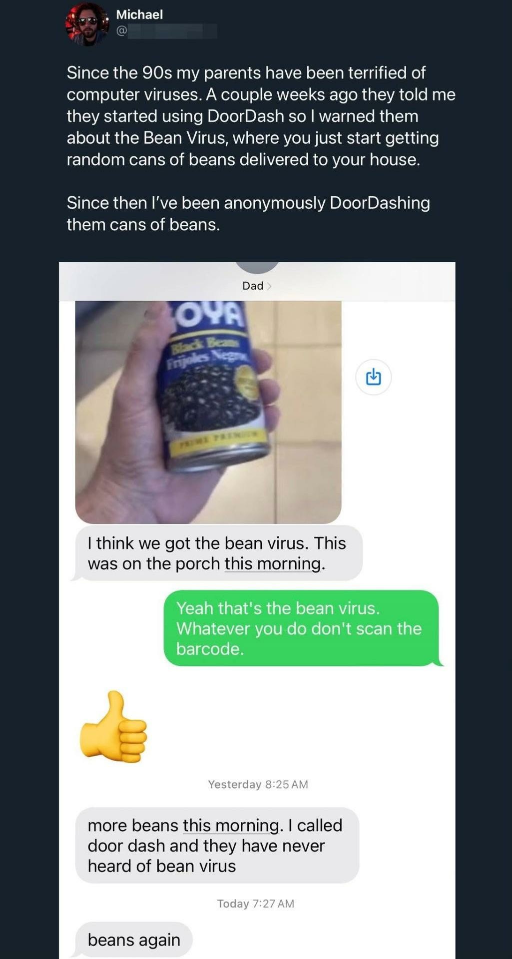 Since the 90s my parents have been terrified of computer viruses. A couple weeks ago they told me they started using DoorDash so I warned them about the Bean Virus, where you just start getting random cans of beans delivered to your house.
