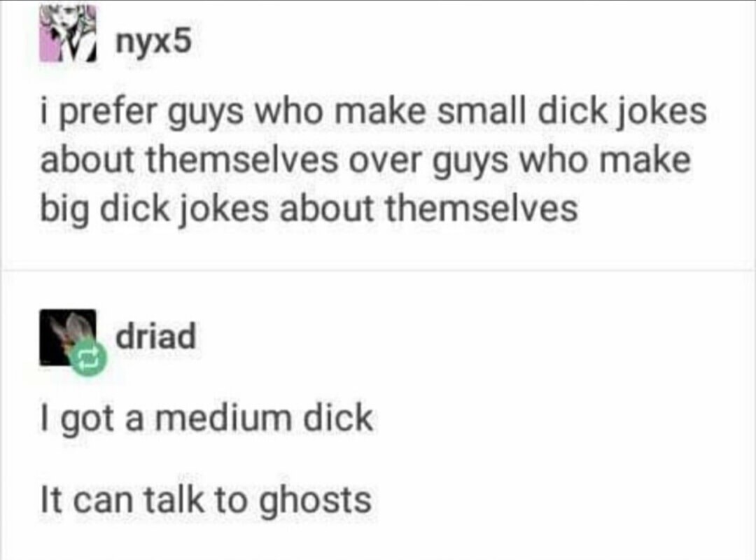 Yea exactly. Both variants are funny in their own way. And I don’t think anybody thinks that someone who’s doing a big/small dick joke is seriously referring to their actual size.