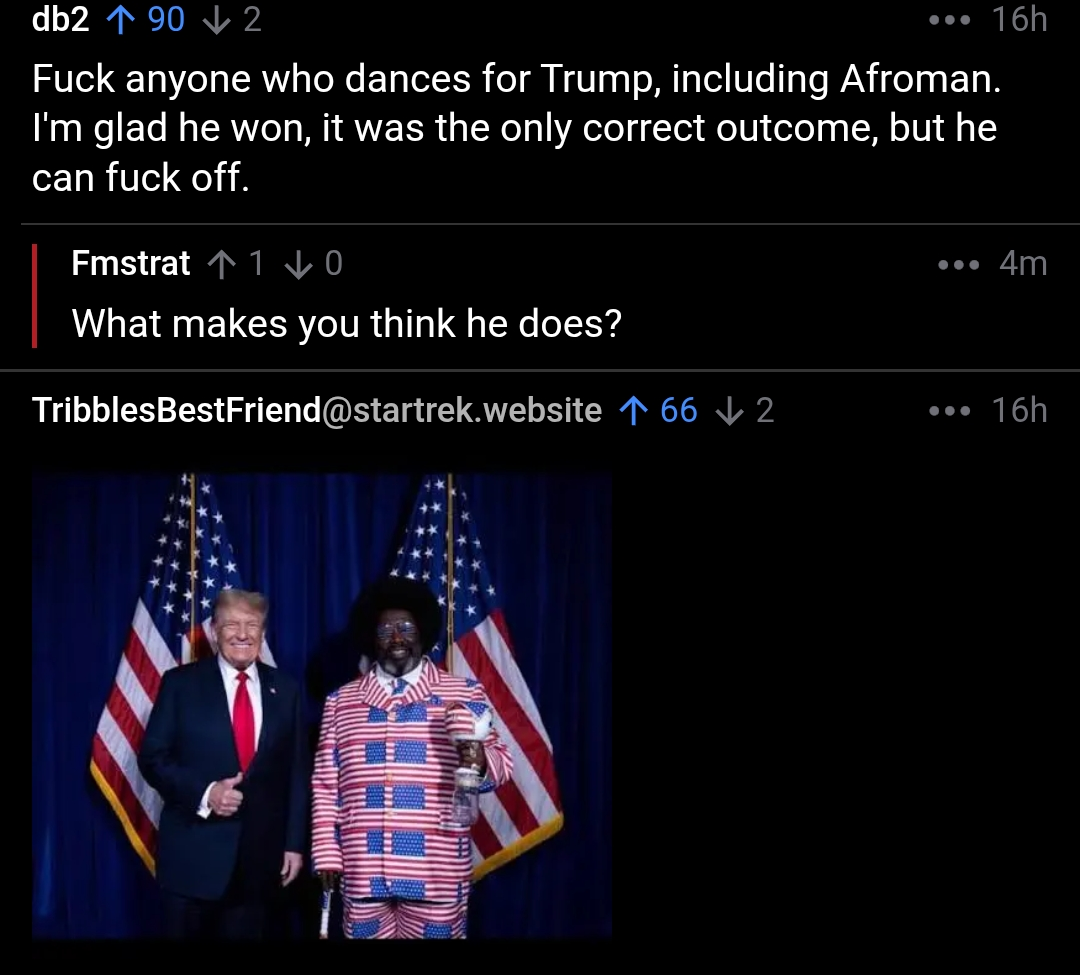 Fuck anyone who dances for Trump, including Afroman. I’m glad he won, it was the only correct outcome, but he can fuck off.
