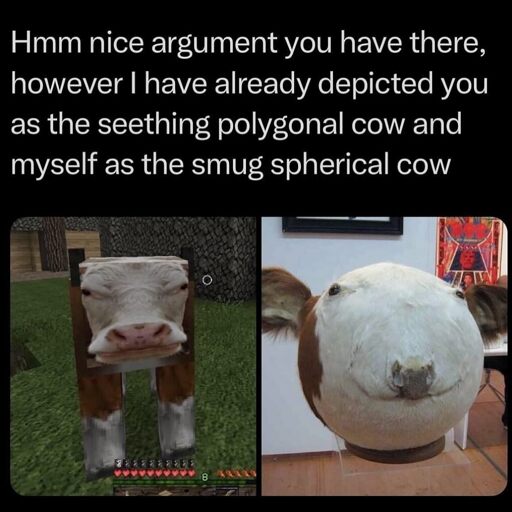 minus-squarelinuxgator@lemmynsfw.comlinkfedilinkEnglisharrow-up22·1 year agoThose are the kinds of cows I learned about in thermodynamics.