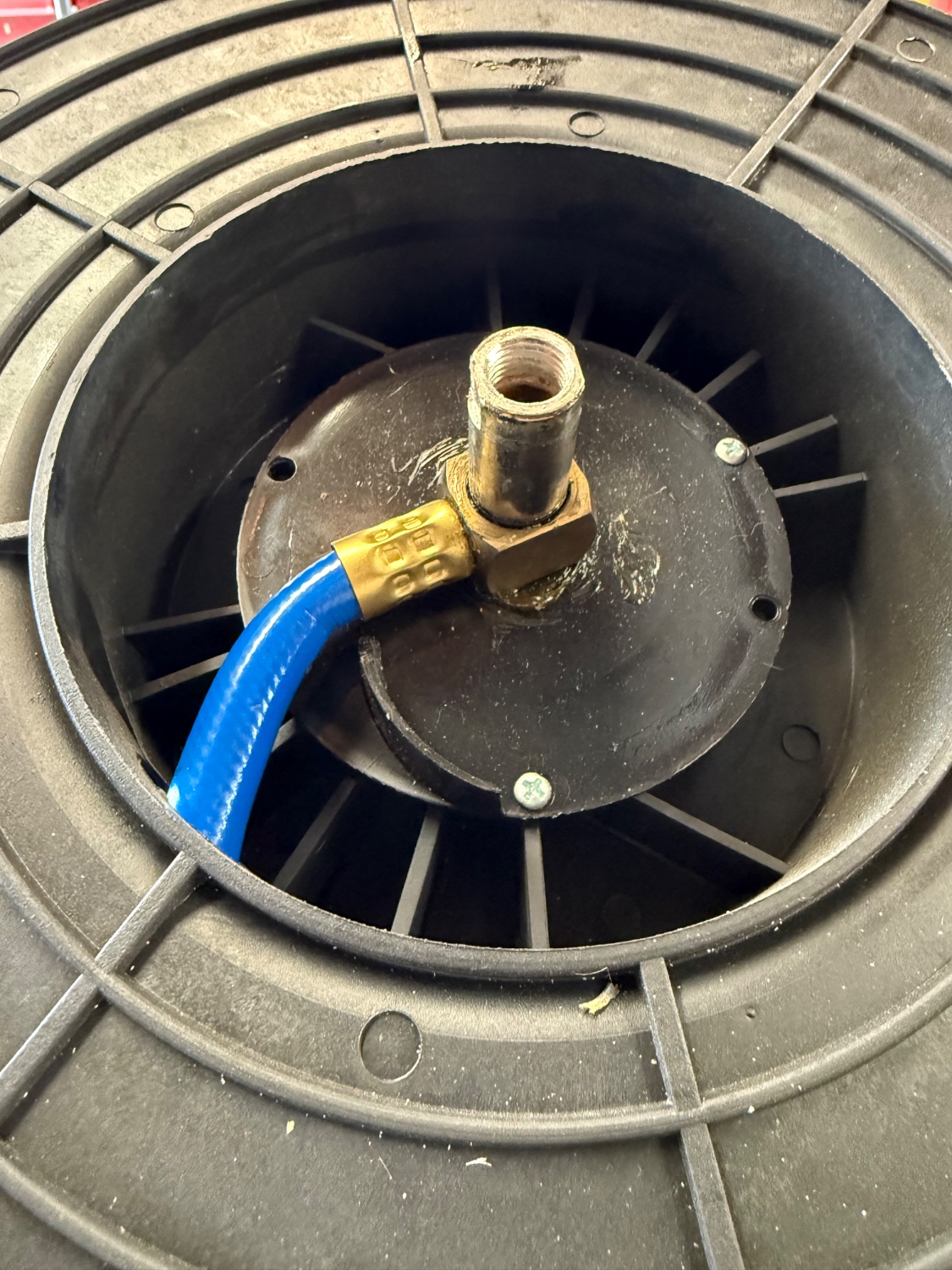 I wouldn’t have expected a worm clamp in here, but a standard air hose is crimped onto a threaded end (same as on the pigtail for this reel). Female threads on an angled exit from the swivel would make hose replacement easy, without adding significant labor (there are already two threaded connections on this unit).