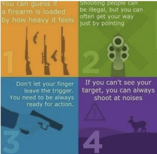 minus-squaregrillgamesh@lemmy.dbzer0.comlinkfedilinkEnglisharrow-up70arrow-down2·7 months agoobligatory firearm safety reminder: rule one is “keep your finger off the trigger until ready to fire” rule two is “never point the weapon at anything you are not willing to destroy” rule three is “always treat any weapon as though it is loaded” rule four is “know your target and what lays beyond it” only by holding each other accountable can we make sure that everyone stays safe and has fun.
