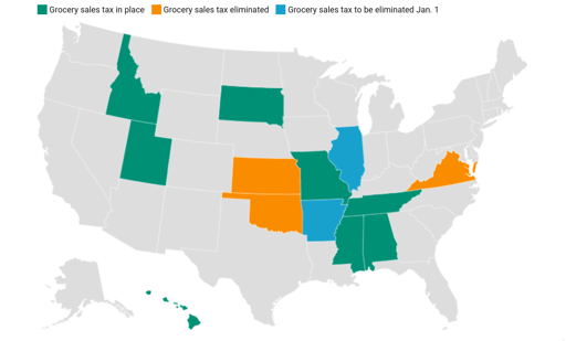This is a trick right?. Many of these states that they say have no grocery sales tax actually have a local tax on groceries. North Carolina for example has no statewide tax but has a uniform 2% local grocery tax.