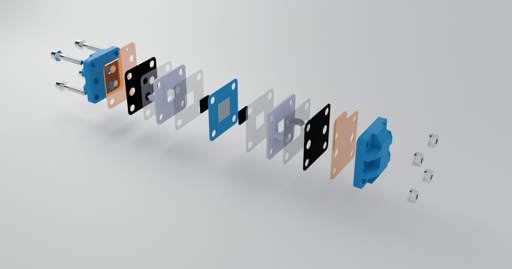 You need Polypropylen filament for printing, graphite felt as electrode, grafoil gasket material as bipolar plate, brass plate as current collector (cut by cnc), silicone gasket material and a measurment device like a potentiostat.