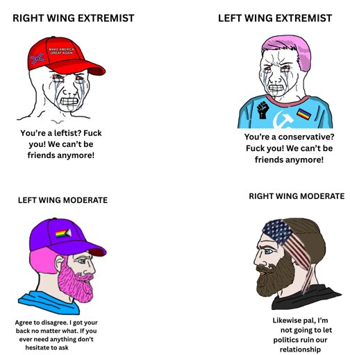 Conservatives are shitty to use here because they are just Nazis. Their whole platform is extreme. You can’t find middle ground with that. But everyone still has an extreme belief of their own.