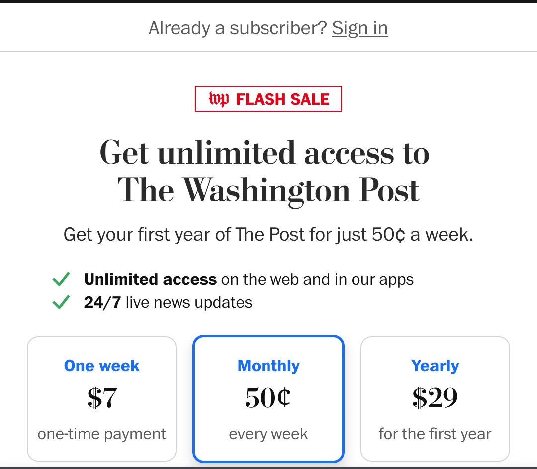 The $2-3 subscription wouldn’t be unreasonable, but I’d rather give it to an outlet that doesn’t try to mislead me even before I become their customer.Premium includes the stories that are critical of Amazon and billionaires, which Bezos usually has pulled from circulation.