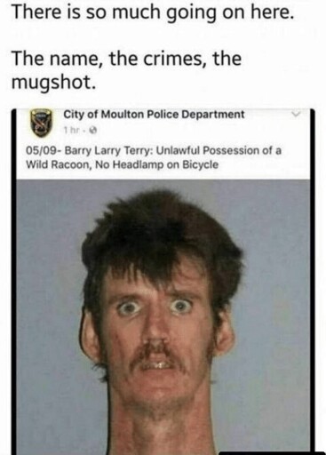 Graham wrote on the photo’s caption that “Barry Larry Terry” was arrested on charges of unlawful possession of a wild raccoon and no headlamp on bicycle.