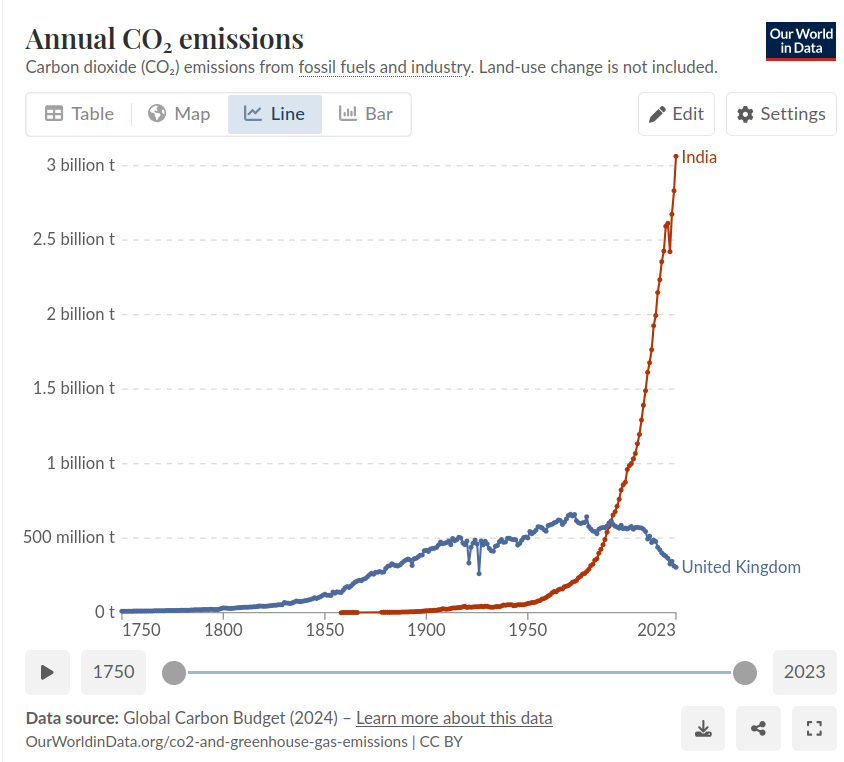 I think they’re just catching up to what countries like the UK did over the past 200 years. So a few hundred thousand more Indian people can afford cars or international holidays these days - that seems fair enough. what’s the indian GHG emisiions per capita? https://en.wikipedia.org/wiki/List_of_countries_by_greenhouse_gas_emissions_per_capita sorry still old data, but 2023 they were not much over half the UK , so what is the fair share of ghg emissions for a person in India? Any why should it be lower than , say, UK - who has a centuries old legacy of fucking the climate. The UK has a hell of a lot more reducing ghg per person to do before it can be any sort of role model -b and thats after nerfing it’s own heavy industry and not counting GHG embodied in imports.