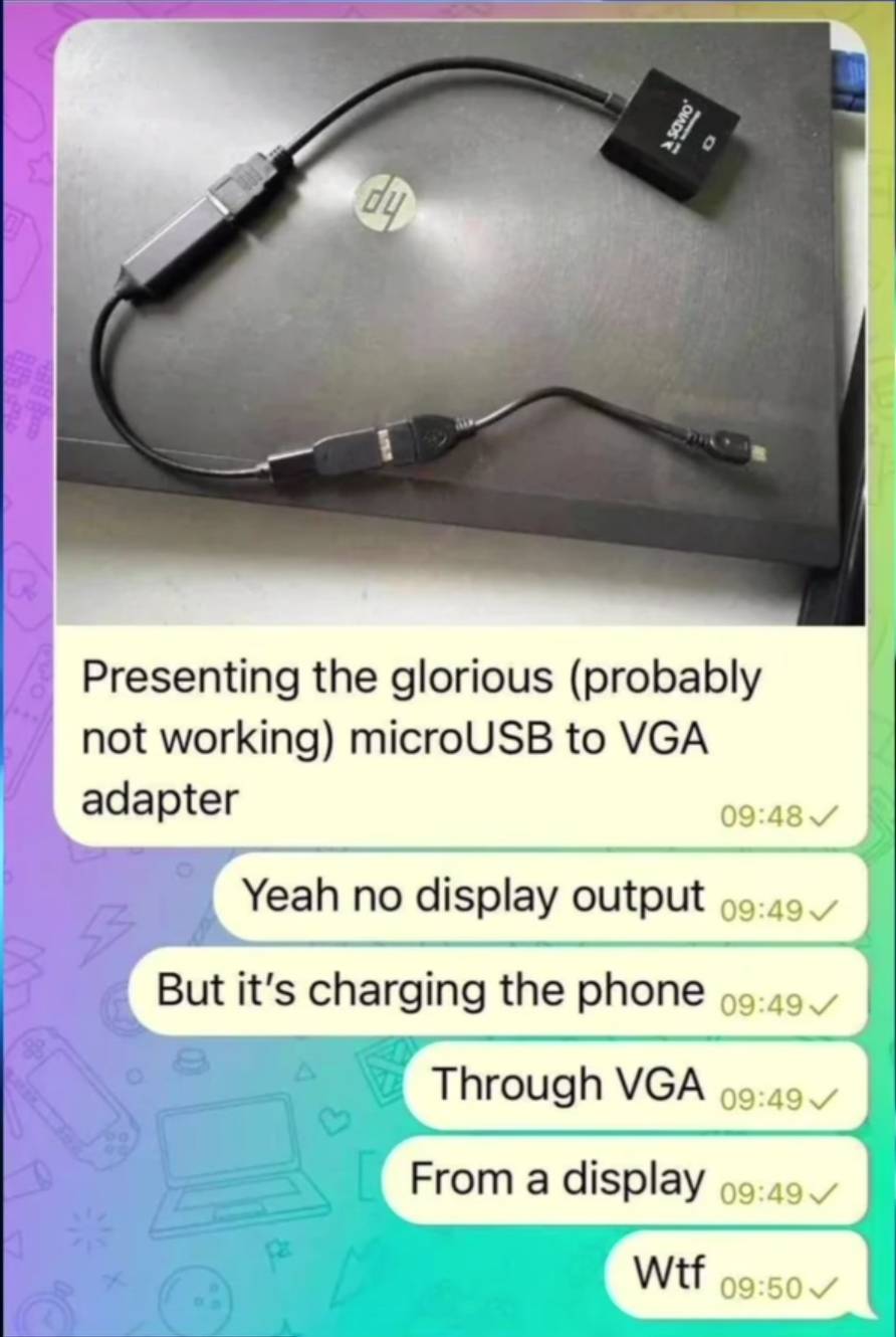 If the vga/hdmi adapter is active then this abomination could actually pass display information provided you had a micro-usb device that supported display out over usb (idk if there is such a thing and if so it probably doesn’t work all that well but still)