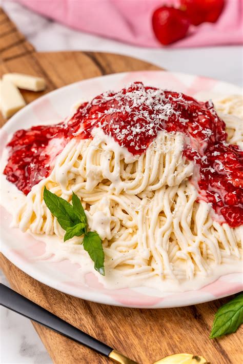 Reminds me of German spaghetti ice cream. Vanilla ice pressed into spaghetti strands on top of whipped cream. Pureed strawberries as the “sauce” with grated white chocolate acting as “cheese”.