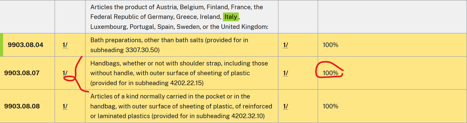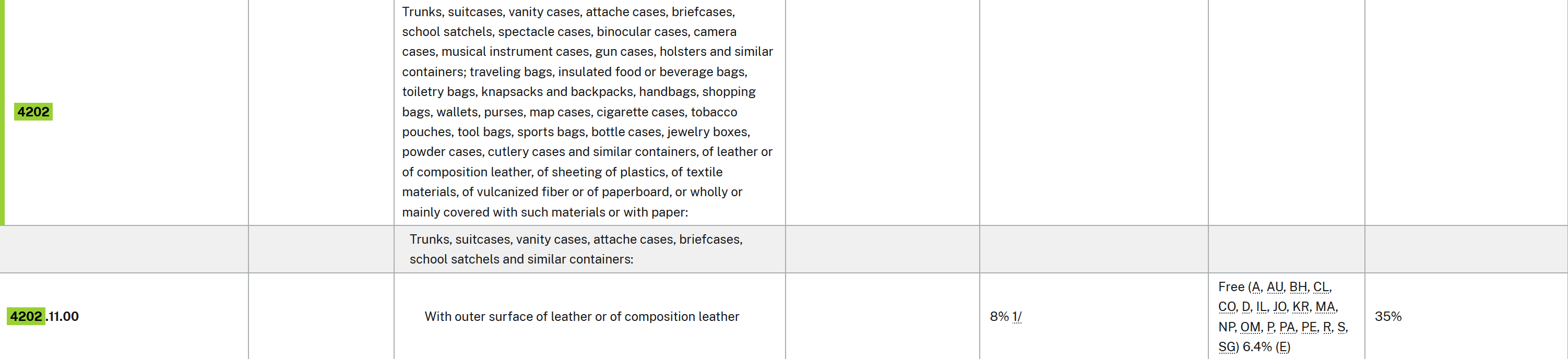 A leather handbag will be in heading 4202 and likely has a 35% tariff, although I’ve heard of people being charged wildly different percentages, from 9 to 65.