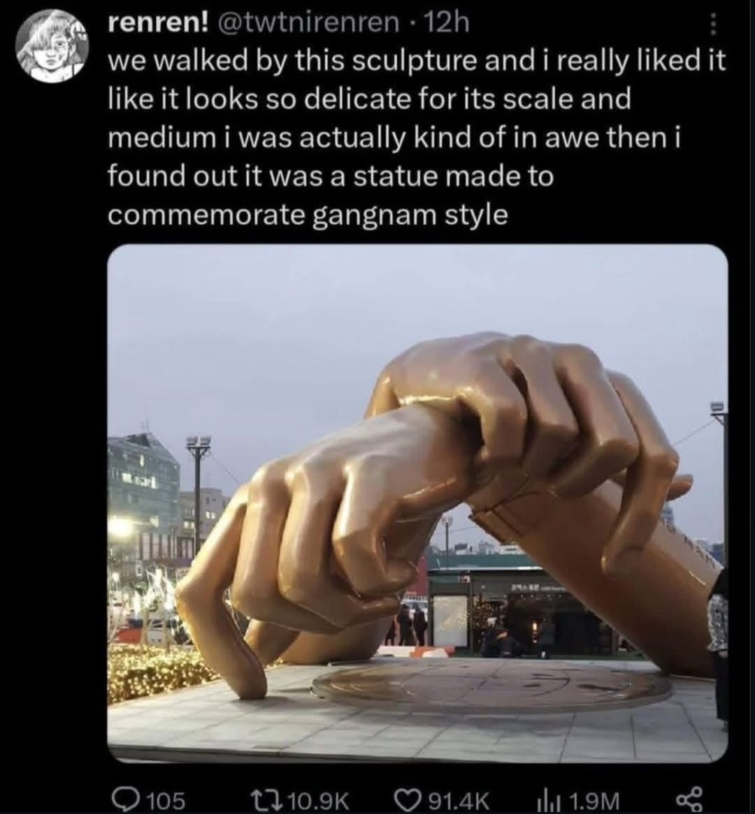 Funny that you mention this. I replied to another comment about how Gangnam Style is satire about the hyper-wealthy. However, the meaning derived by all of the audiences outside of South Korea was ‘haha dancing man likes horses and yoga women’.