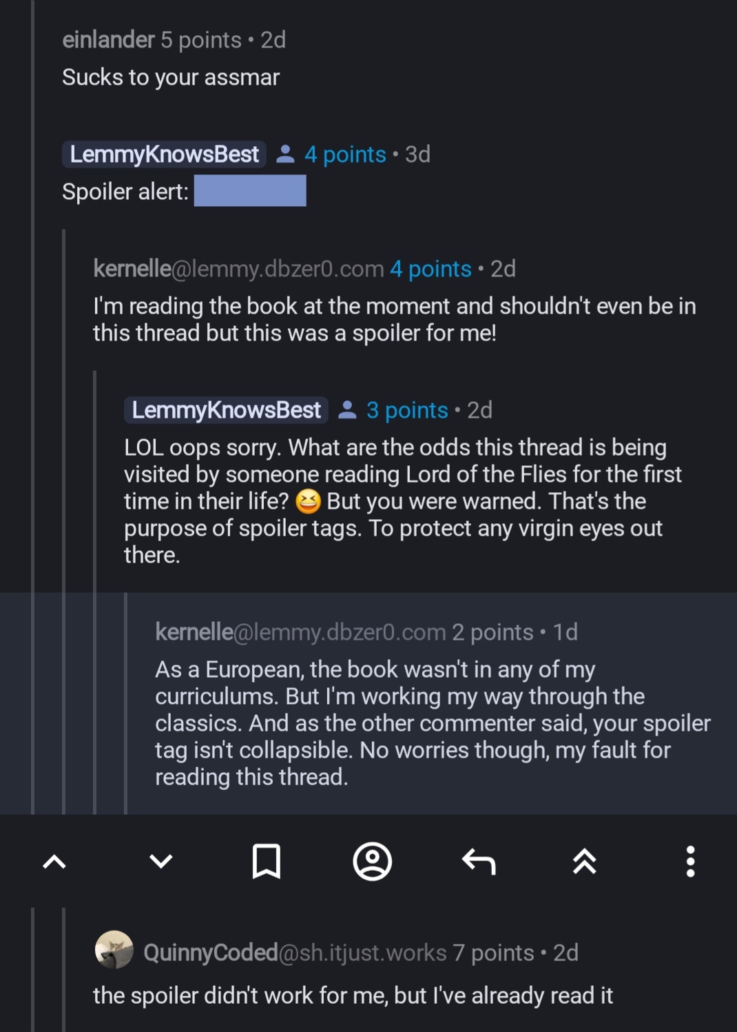 LOL oops sorry. What are the odds this thread is being visited by someone reading Lord of the Flies for the first time in their life? 😆 But you were warned. That’s the purpose of spoiler tags. To protect any virgin eyes out there.