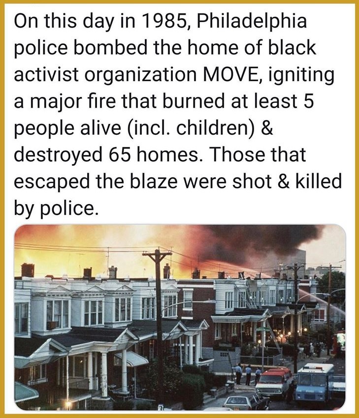 Don’t forgot you are in a country were police bombed a rowhouse (both with surface level explosives and dropping a bomb from a helicopter on it), starting a fire that they allowed to burn that killed 5 children (all children of the ~7 people they were targeting) and burned 61 homes, damaging over 100 more homes (making 100’s of people homeless) within the lifetime of almost all non-local elected officials and then re-elected the mayor responsible: https://www.pbs.org/newshour/show/the-largely-forgotten-history-of-philadelphias-police-bombing-of-black-organization-move https://commons.lib.jmu.edu/jmurj/vol7/iss1/3/