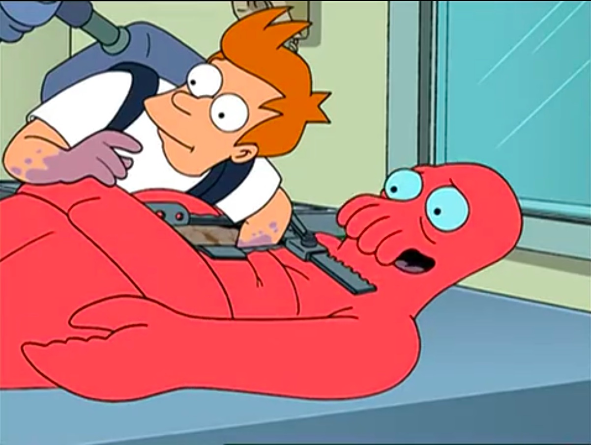 Zoidberg: There you are, good as new. Except for your dorsal fin, I’m afraid I couldn’t find it after the crash.