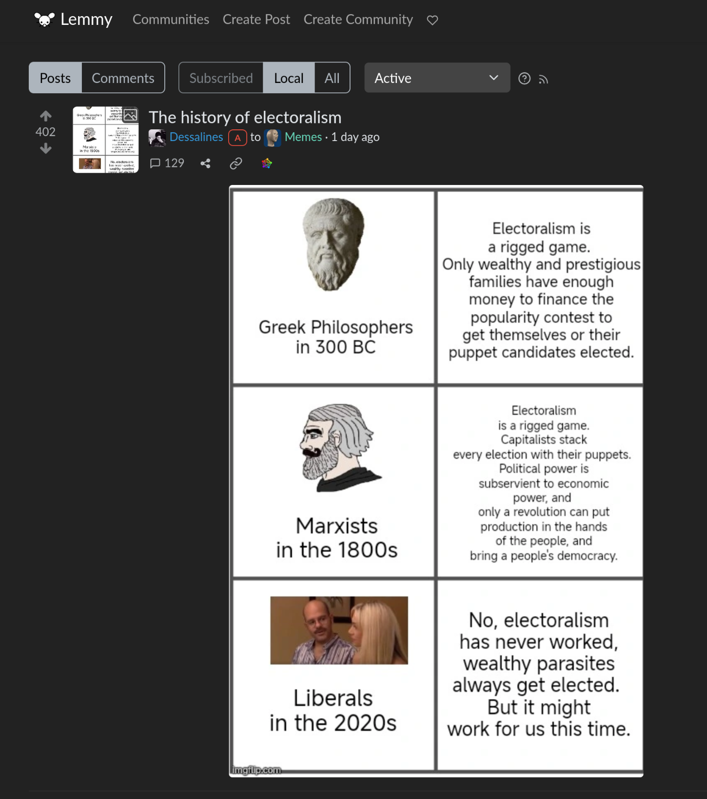 How many people looking at that meme even knew about ancient Greeks shitting on elections in favour of sortition and went there, instead of thinking “elections bad? You must want to have a king, you authoritarian swine”