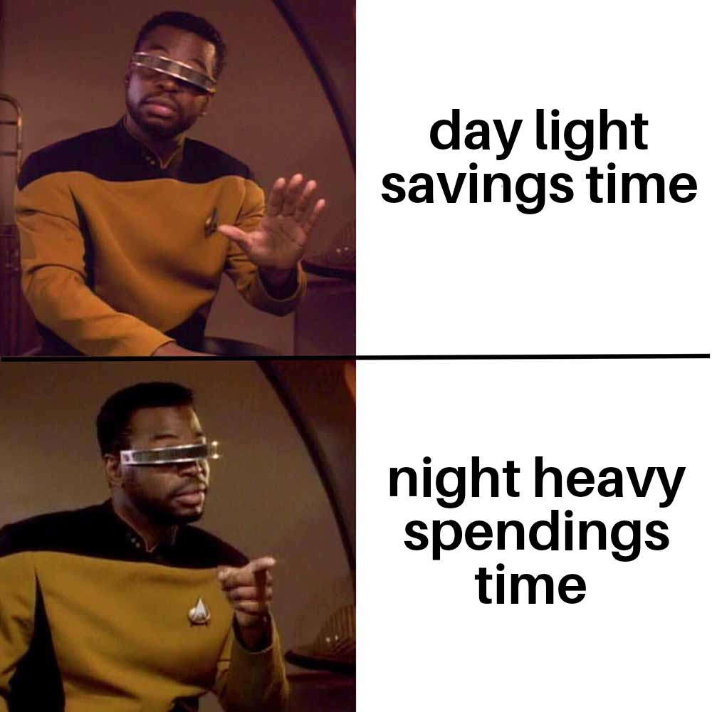Exactly. For a lot of people, the end of the day is your time. The beginning of the day is just getting ready and going to work. It serves the interest of the corporate employers to put more daylight (so to speak) at the start of the workday rather than letting us have that daylight for ourselves after work. It’s daylight theft!
