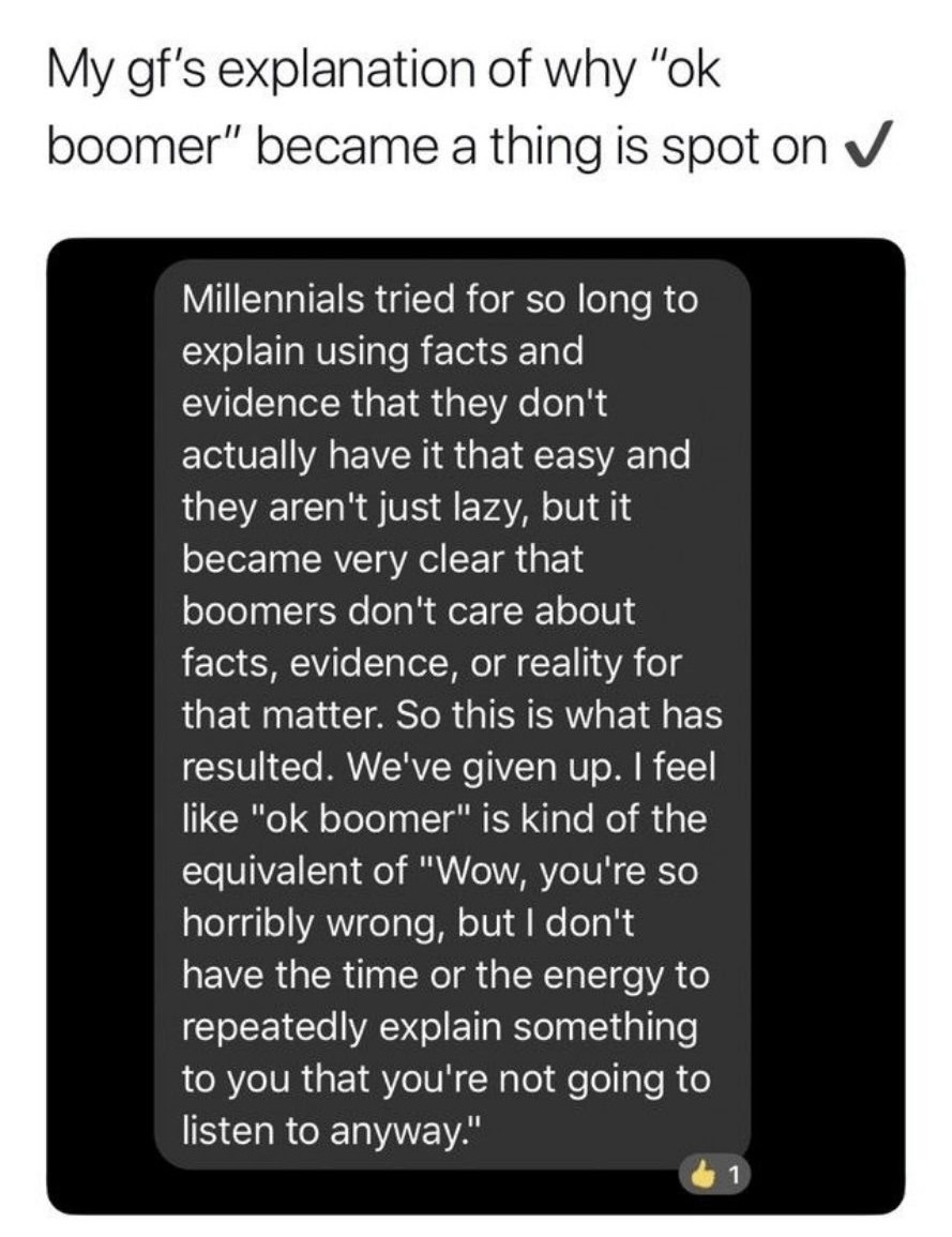 This gives me flashbacks to the one time in my life I really wanted to answer “okay boomer”