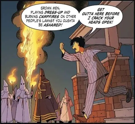 It should be noted how many members of the Klan were, themselves, landlords and politicians and industrial millionaires of the era. They used their superior resources and their political connections with the police to engage in violent vigilantism against “criminals” like Emmett Till and Joe Spinner Johnson. And they organized within the Klan to promote racist policies at the public level, in the same way that Wayne Enterprises influences politics in Gotham City.