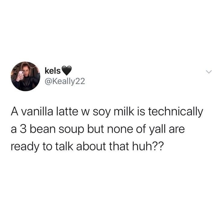 A post by kels @Keally22 with the text “A vanilla latte w soy milk is technically a 3 bean soup but none of yall are ready to talk about that huh??”